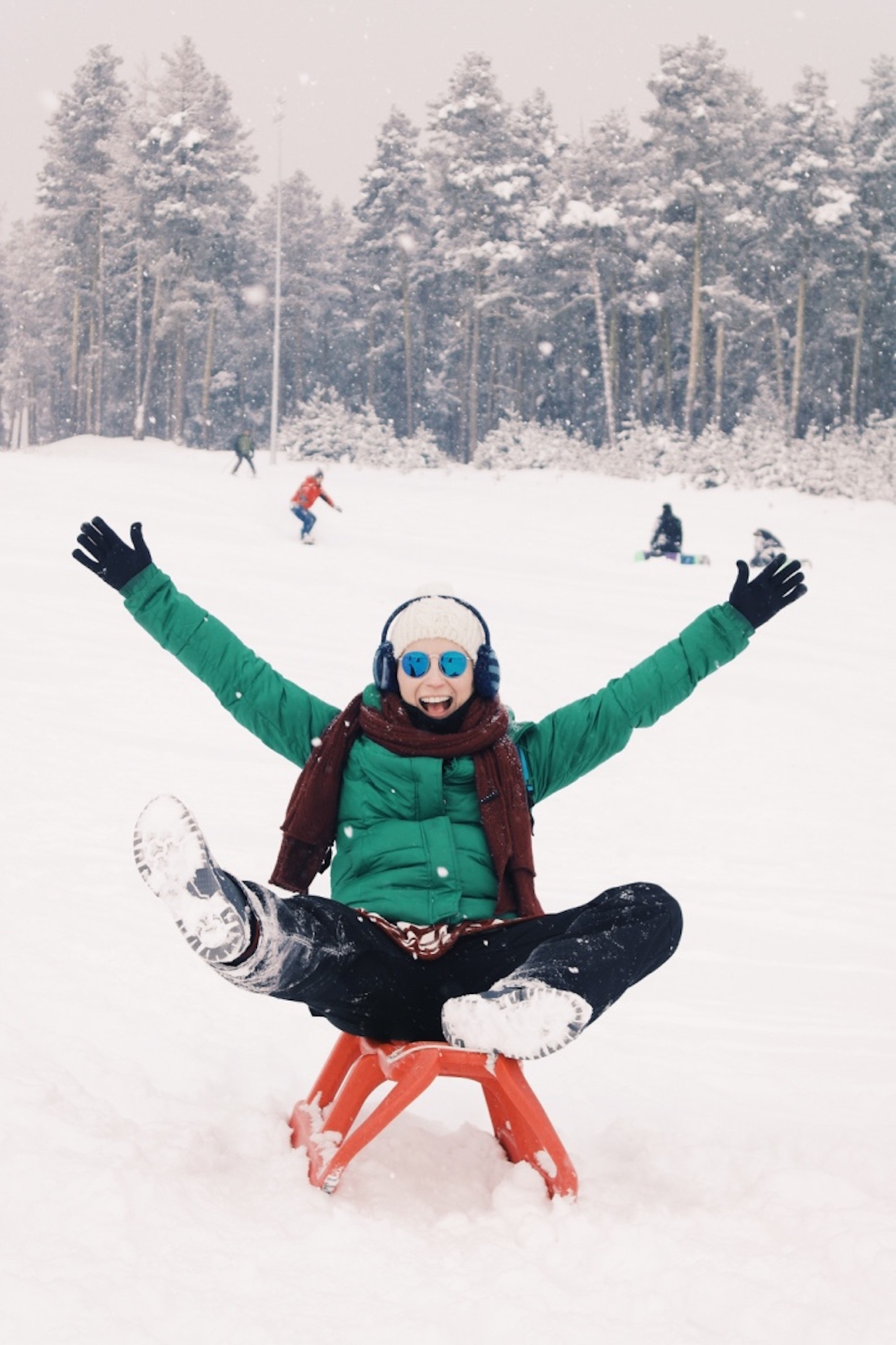 Epey şenlikli etraf. Ve oldukça kalabalık. Bir yanda usta kayakçılar vızır vızır iniyorlar tepeden, bir yanda acemiler ders alıyor. Çok fazla çocuk var, kayan, düşen, koşan, yuvarlanan… Aslında herkes biraz çocuk burada. Otellerin birinden müzik yükseliyor. Tabi yine her yer bembeyaz. Bizi de sarıyor ortam hemen. Koşa koşa en yakın otelin ekipman kiralama yerine gidiyoruz. Dönüş için son minibüs 15:30’da olduğu için kayak dersi almak için pek vaktimiz yok. Biz de kızak kiralayıp, çocukların arasına karışıyoruz.