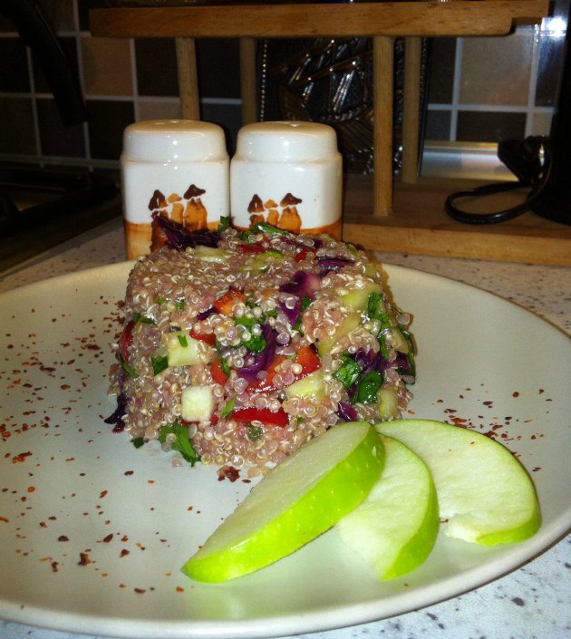 4) Kinoa soğuyunca, üzerine 1 kaşık zeytinyağını, lahanayı ve nar ekşisini ekliyoruz.