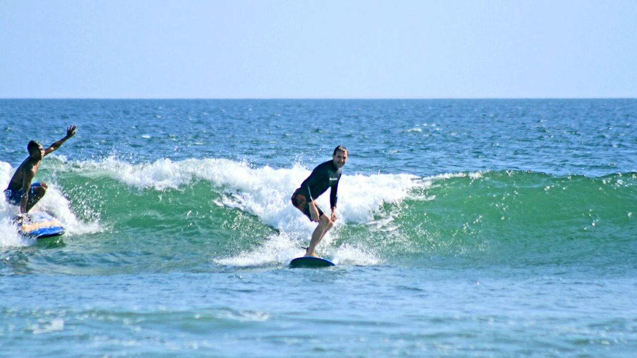 Ben son günümüz hariç dengeli ama ağır “soft board”lardan kullanırken, Levent bir kaç gün içinde daha az stabil ama daha hafif olan “hard board”a geçti. Başlangıç-orta seviye sörfçülerin genelde kullandıkları board’ların stabiliteye karşılık ağır olmasından dolayı kollar onu yüzdürebilmek için çok yoruluyor. Daha da önemlisi “take-off”tan hemen önce, yani sürülecek olan dalga arkadan yaklaşırken, board’un dalgayla aynı hıza erişebilmesi için son derecede hızlı ve güçlü kulaç atmak (“paddle” yapmak) gerekiyor. Bu şahsen halen en çok zorlandığım kısımlardan biri ve o sırada bize eşlik eden eğitmen, dalga yaklaşırken board’umun arkasından itmese dalga yakalayabilmem çok zordu.