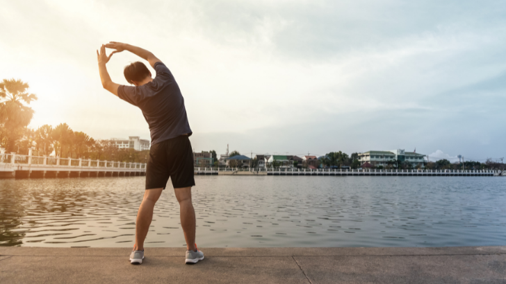 3. Nefes alırken yukarı doğru uzanın; nefes verirken omurganız dik kalacak şekilde, sağa doğru eğilmeye çalışın.