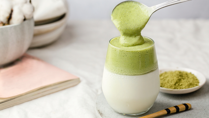 5. Sütün üstünü yeşil köpük karışımıyla doldurun, üzerine süslemek için azıcık matcha tozu serpin ve içeceğinizin tadını çıkarın. Afiyet olsun!