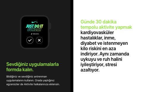 En az 30 dakikalık tempolu yürüyüşe eşdeğer aktivite yapın, Egzersiz halkanız tamamlansın.