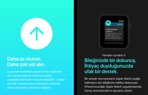 Uzun süre oturmak sağlık sorunlarına neden olabiliyor. Bu nedenle Apple Watch, Duruş hedefinize ulaşmak için kaydettiğiniz ilerlemeyi takip ediyor ve gün boyunca sizi ayağa kalkmaya teşvik ediyor. Daha az oturmak kan basıncının düşmesine, enerjinin yükselmesine ve kardiyovasküler hastalık riskinin azalmasına yardımcı olabiliyor.