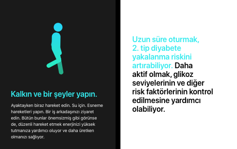 Günde 30 dakika tempolu aktivite yapmak kardiyovasküler hastalıklar, inme, diyabet ve istenmeyen kilo riskini en aza indiriyor. Aynı zamanda uykuyu ve ruh halini iyileştiriyor, stresi azaltıyor. Uzun süre oturmak ise 2. tip diyabet riskini artırabiliyor. Daha aktif olmak, glikoz seviyelerinin ve diğer risk faktörlerinin kontrol edilmesine yardımcı olabiliyor.