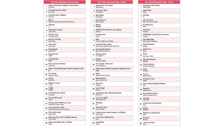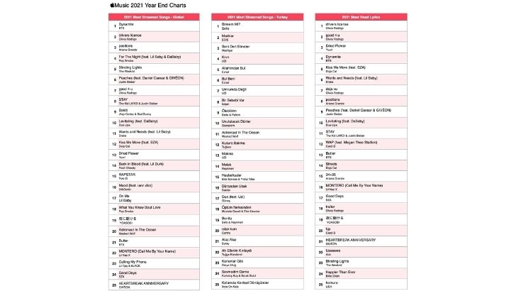 Apple Music dünya listelerinde 2021’in en çok dinlenen şarkısı BTS’den” Dynamite” olurken Türkiye listelerinde ilk sırada Sefo’dan “Bilmem Mİ?” şarkısını EDİS’den “Martılar” ve Madrigal’den “Seni Dert Etmeler” parçası takip ediyor. 2021’in en çok Shazamlanan parçası ise hem dünya hem Türkiye listelerinde Masked Wolf’tan “Astronaut in the Ocean” olarak karşımıza çıkıyor.