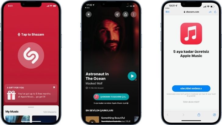Hala Apple Music üyesi değilseniz Shazam’ladığınız bir parçayla beraber 5 aya kadar ücretsiz Apple Music üyeliği hemen başlatabiliyorsunuz.