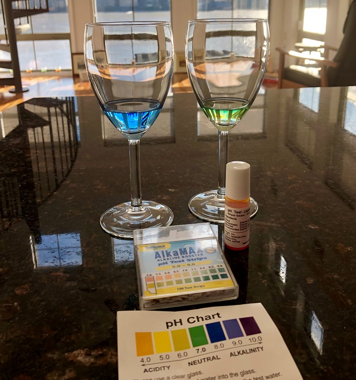 Marketten aldığım 1,5lt lik sudan, 2. bardağa 2 parmak kadar su koydum. İçine 4 damla suyun aist/alkali seviyesini ölçen bir karışım damlattım. Rengi sarı-yeşil arası bir ton aldı. Yani bu o suyun pH’inin 6.0 civarlarında olduğunu gösteriyor. Oysa ki en ideali 8 civarı…. Açık Mavi renk.