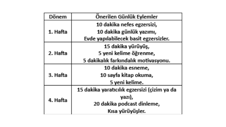 Yenilenme planına dahil edeceğiniz eylemler ne kadar basit ve somut olursa, günlük rutin haline getirmek de o kadar kolay olacaktır. Karmaşık ya da büyük adımlar yerine, küçük ama düzenli olarak sürdürülebilecek adımlar belirlemek, stratejik açıdan başarı şansını artırır.