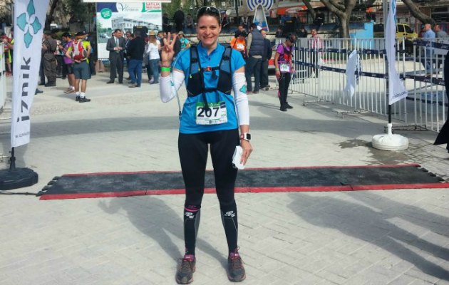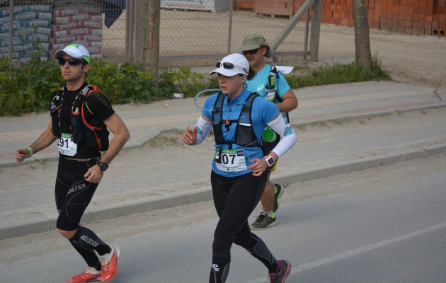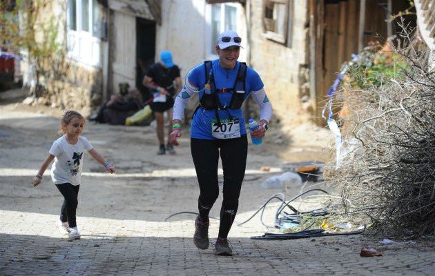 Tek hedefim, yarışı iyi bir şekilde güçlü hissederek ve güler yüzle bitirmekti. Koşmaya başladım, ilk 15 km düz gidiyorduk. Zeytin ağacı tarlasına girer girmez susuz kaldım. Hemen yarış grafiğe baktım. Gelecek kontrol noktası 19 km ötede Sölöz’deydi. Hava çok sıcaktı ve otomatik bir şekilde düzenli olarak su içtim. Orada da yarış içinde başka bir yarış başladı. Aynı tempo üç kız koşuyorduk: Ömür Birler, Ceren Hancıoğlu ve ben. Devamlı birbirimizi geçtik. Birkaç kez ikisinin arkasında bile kaldım. Kendi tempom ile ilerliyordum.