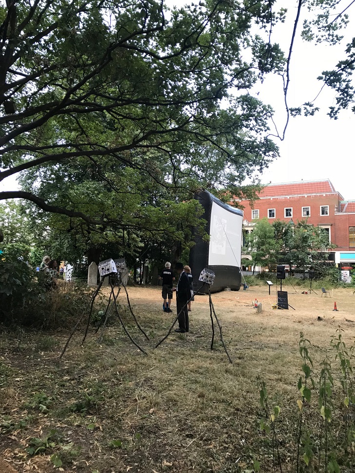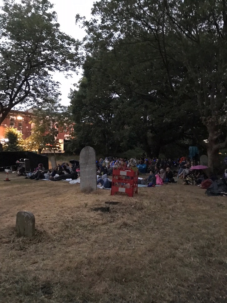 Görevliler filmin güneş batınca yayınlanmaya başlayacağını belirtmişlerdi. İnsan mezarlıkta gece açık hava sineması denilince Kuşlar gibi bir film bekliyor tabii. Ama bugünün programında Notorious vardı. Filmi izlemeyenler için spoiler vermeyeyim ama Ingrid Bergman’lı bir drama ve aksiyon filmi olduğunu söyleyebilirim. Film başlamadan hemen önce, Leytonstone’lu bir sinema eleştirmeni filmi nasıl yorumlamamıza dair kısa bir konuşma yaptı. Yağmur durduğu için şanslıydık. Kahvemizi, küçük tatlımızı alıp, tepemizdeki ağaçtan ara ara da olsa düşen yağmur damlaları eşliğinde yatıp yuvarlanarak filmi izledik.