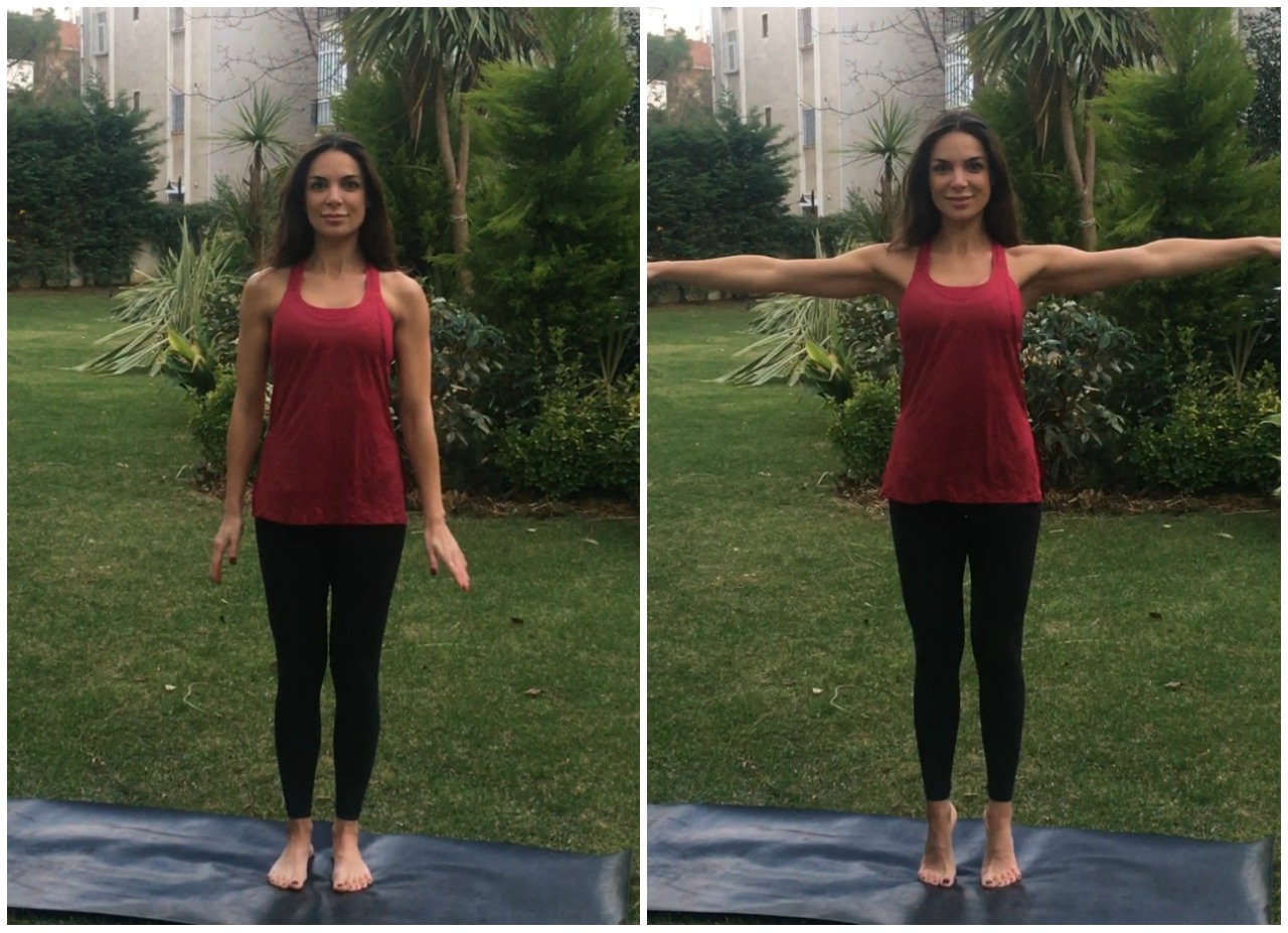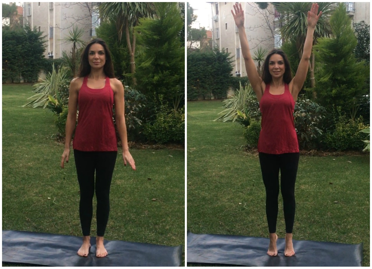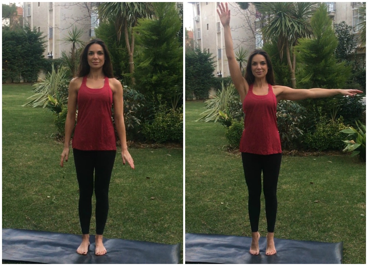 İlk olarak ayaklarınızı yere sağlam basın ve ayakların arasında yaklaşık bir ayak mesafe bırakarak dik bir duruşa gelin. Dik duruş hakkında Doğru bir duruş hayatımızda çok şeyi değiştirebilir başlıklı yazımı okuyabilirsiniz. Burnunuzdan nefes alın ve burnunuzdan nefes verirken ayak parmak uçlarına yükselin. Aynı anda sağ kolu yukarıya, sol kolu yana kaldırın. Bu pozisyonda bir nefes alın ve nefes verirken ayak tabanlarınızı ve kollarınızı yere indirerek başlangıç pozisyonuna dönün. Aynı yönde 3 tekrar yapın ve sonra sol kol yukarı sağ kol yana olacak şekilde ters yönde 3 kez tekrarlayın ve son olarak çift kol yana ve çift kol yukarı şeklinde hareketi 3’er tekrar daha yapın.