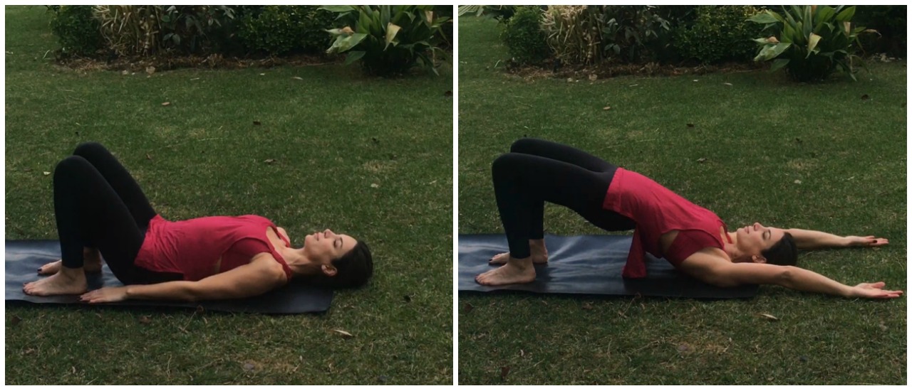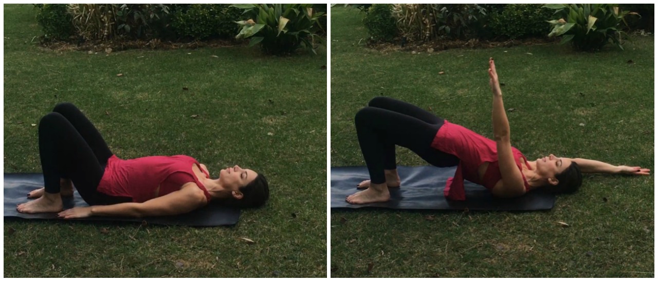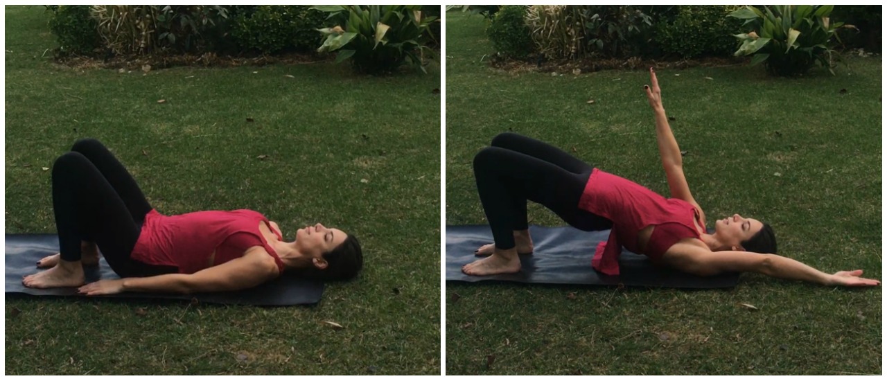 Sırt üstü, dizler bükük, ayaklarınız dizlerinizin altında yere basacak şekilde yatın. Kollarınız gövdenin iki yanında vücudunuza yakın dursun. Nefes alın ve nefes verirken kalçanızı yukarı kaldırın, aynı anda sağ kolu başın yanında, sol kolu tavana doğru yukarı kaldırın bu pozisyonda bir nefes alın ve nefes verirken başlangıç pozisyonuna dönün. Aynı yöne 3 tekrar daha sonra diğer yöne 3 tekrar ve aynı anda iki kolu tavana ardından iki kolu başın yanına uzatacak şekilde 3’er tekrar yapın.