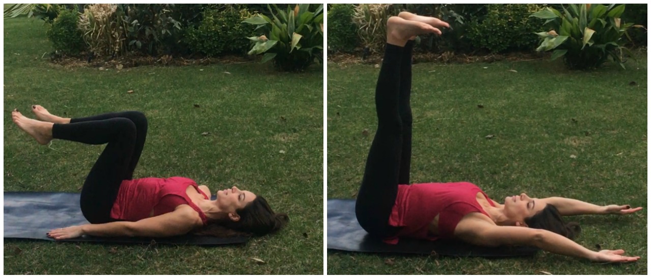 Harekete başlamadan önce rahat bir oturuşa gelin ve gözlerinizi kapatın. Önceki hareketlerin vücudunuza etkilerini gözlemleyin. Tekrar sırt üstü uzanın, dizlerinizi karnınıza doğru çekin, kollar gövdenin iki yanında yerde, belinizi yerde yumuşak tutmaya özen gösterin. Burada bir nefes alın ve nefes verirken aynı anda hem kolları başın iki yanından yukarı hem de bacakları tavana doğru kaldırın. Bacaklar yukarıda ayak tabanları tavana doğru dururken nefes alın ve nefes vererek başlangıç pozisyonuna geri dönün. 6 tekrar yapın.