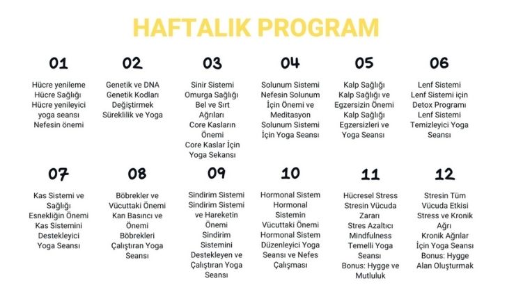 Program her hafta bir konuya odaklanıyor. Haftanın konusuyla ilgili, kişinin fiziksel durumuna özel hazırlanmış, yoga, meditasyon ve nefes çalışmalarından oluşuyor. Odaklanılan konuya uygun beslenme ve detoks tavsiyelerini de içeriyor. Haftalık konular ve program da şu şekilde…