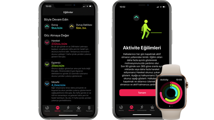 Apple Watch’unuzda bulunan Aktivite Halkalarınızı her gün kapatmak aktif olmanın yollarından biridir. Eğilim okları daha fazla ayrıntı göstererek motivasyonunuzda yardımcı olur. Son 90 günde son 365 güne oranla aynı miktarda veya daha fazla hareket ediyorsanız Hareket okunuz yukarı gösterir. Ayağa az kalkıyorsanız Duruş okunuz aşağı gösterir. Halkalarınızı kapatmak ve oklarınızı izlemek aktif olmanıza ve aktif kalmanıza yardımcı olur.