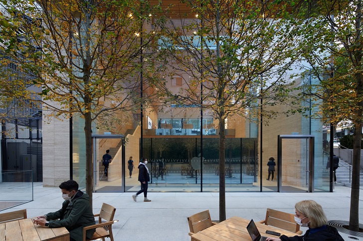 İçeride, ziyaretçileri video duvarı ve Today at Apple atölye çalışmalarına ev sahipliği yapan Forum alanı karşılıyor. Üst katta ise müşterileri, Apple’ın en yeni ürün ve servislerini yakından inceleyebilecekleri bir alan bekliyor. Mekanın tamamı 9 metrelik cam giydirme ön cepheden dışarıyı görüyor ve böylece içerisi ile dışarısı arasındaki sınır belirsizleşiyor. Havalandırma için açılabilen iki büyük tavan penceresi de içerisinin bol gün ışığıyla dolmasını sağlıyor.