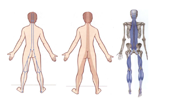 Yukarıdaki şekillerde bedenimizin arkasında yer alan arka miyofasyal hattın (arka miyofasyal meridyen) soldan sağa doğru tek boyutlu, iki boyutlu ve üç boyutlu görüntüsü yer alıyor (Myers T, Anatomy Trains, 2008).