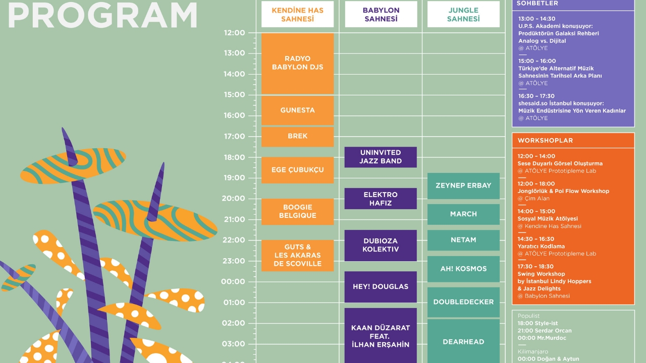 Babylon Soundgarden’da bu sene; GUTS & Les Akaras de Scoville, Dubioza Kolektiv, Kaan Düzarat feat. İlhan Erşahin, Boogie Belgique, Ege Çubukçu, Hey! Douglas, Ah! Kosmos, Elektro Hafız, Doubledecker, DearHead, BREK, Netam, MARCH, Zeynep Erbay, Gunesta, Uninvited Jazz Band, Radyo Babylon DJ’leri, DJ Style-ist, Serdar Orcan ve Mr.Murdoc sahne alacak.