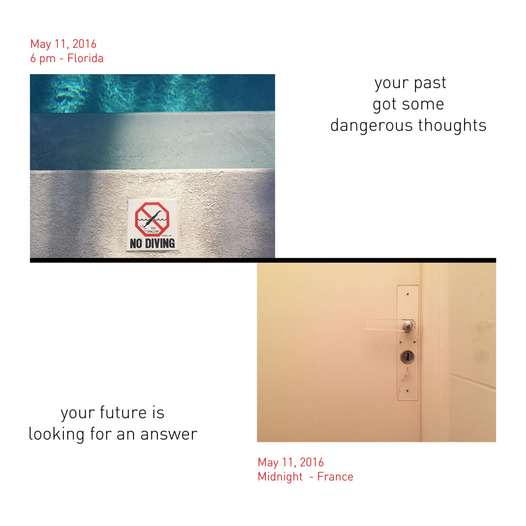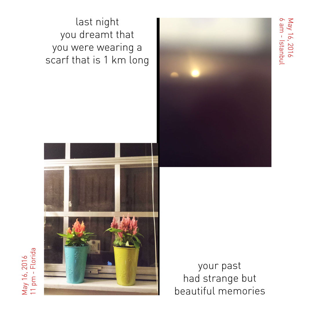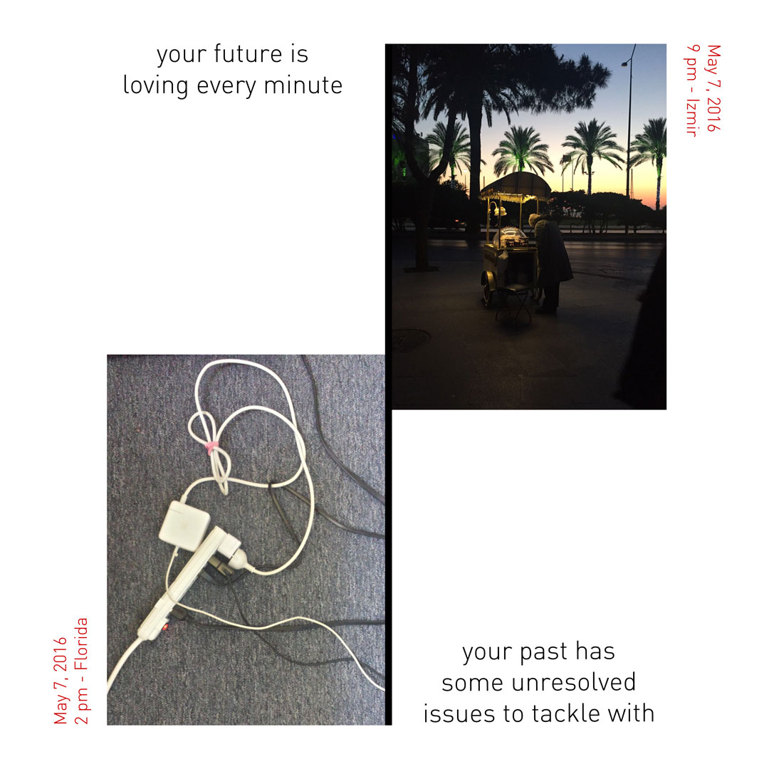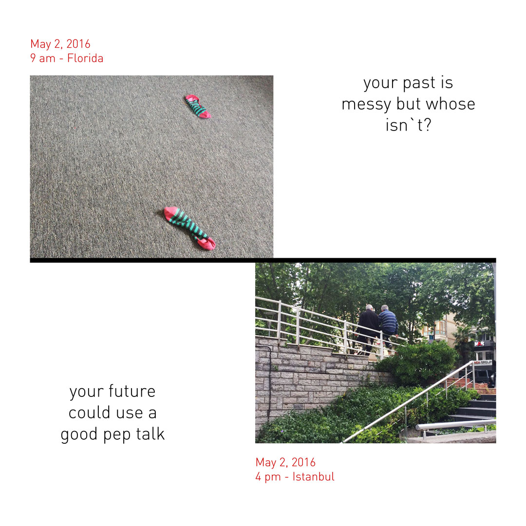 Şirin: Projemiz, fotoğraf ve yazı üzerinden geçmiş/gelecek ve zaman/mekan kavramlarıyla oynadığımız bir iş. Her gün Marşa’yla aynı anda bir fotoğraf çekiyoruz. Fakat o İstanbul’da, ben Florida’da yaşadığımız için, aynı anda çeksek bile aramızda 7 saat fark oluyor. Dolayısıyla bir anlamda ben Marşa’nın geçmişine tanıklık etmiş oluyorum, o da benim geleceğime. Çektiğimiz fotoğraflara, fotoğrafın içeriğine de göz kırpan, geçmiş ve gelecekle ilgili birer cümle eşlik ediyor. O yüzden ortaya biraz mizahi biraz şiirsel bir iş çıkıyor. Her gün bir saat atlayarak çektiğimiz fotoğrafları da Digital Artist Residency’de günlük tutar gibi yayınlıyoruz.