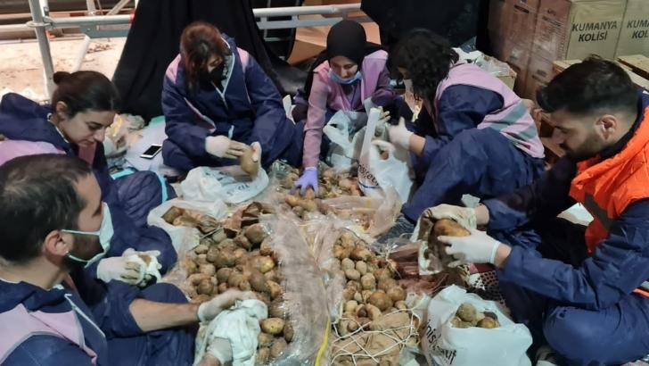 Bir yandan da gelen siparişler sahiplerini ulaştırılmak üzere kolileniyor. Mümkün olduğunca hızlı bir şekilde. O kısım da şöyle: İstasyonlarda çalışan gönüllülerin dışında bir de market arabalarıyla runnerlar var. Runnerlar gelen siparişi alıyor ve istasyon istasyon dolaşıyorlar. Mesela gıda istasyonuna gidip diyorlar ki, “7 kişilik aile, 2 çocuk” Gıda bölümü aileye uygun koliyi hazırlıyor. Üstüne runnerın ismini yazıp koliyi kenara koyuyor. Aynı şekilde, sipariş alacakları tüm istasyonları geziyor runnerlar. Ta ki ihtiyaç sahibinin siparişi tamamlanana kadar. Sonra bir sonraki siparişe geçiyorlar, sonra bir sonrakine. Tabii iş sadece runnerlara siparişlerini teslim etmekle bitmiyor. Çuval çuval patates ve soğan geliyor depoya. Patateslerin çoğu çamurlu ve ıslak. Çuvallar açılıyor, çamurlu patatesler tek tek silinip kontrol ediliyor. Yenilebilir durumdakiler poşetleniyor, çürükler atılıyor. Çamursuz patatesler ve soğanlar da aynı şekilde kontrol edilip, poşetleniyor. Ardından gıda kolisi hazırlayanlardan biri geliyor, “Çok sipariş var. Ne durumda?” diye soruyor. “Tamam.” diyor patatesçiler, “Hallediyoruz.” Kendi istasyonunda o gün için yapacak işi kalmayan gönüllüler durur mu? Duramıyorlar tabii. Gidiyorlar başka bir istasyona:
