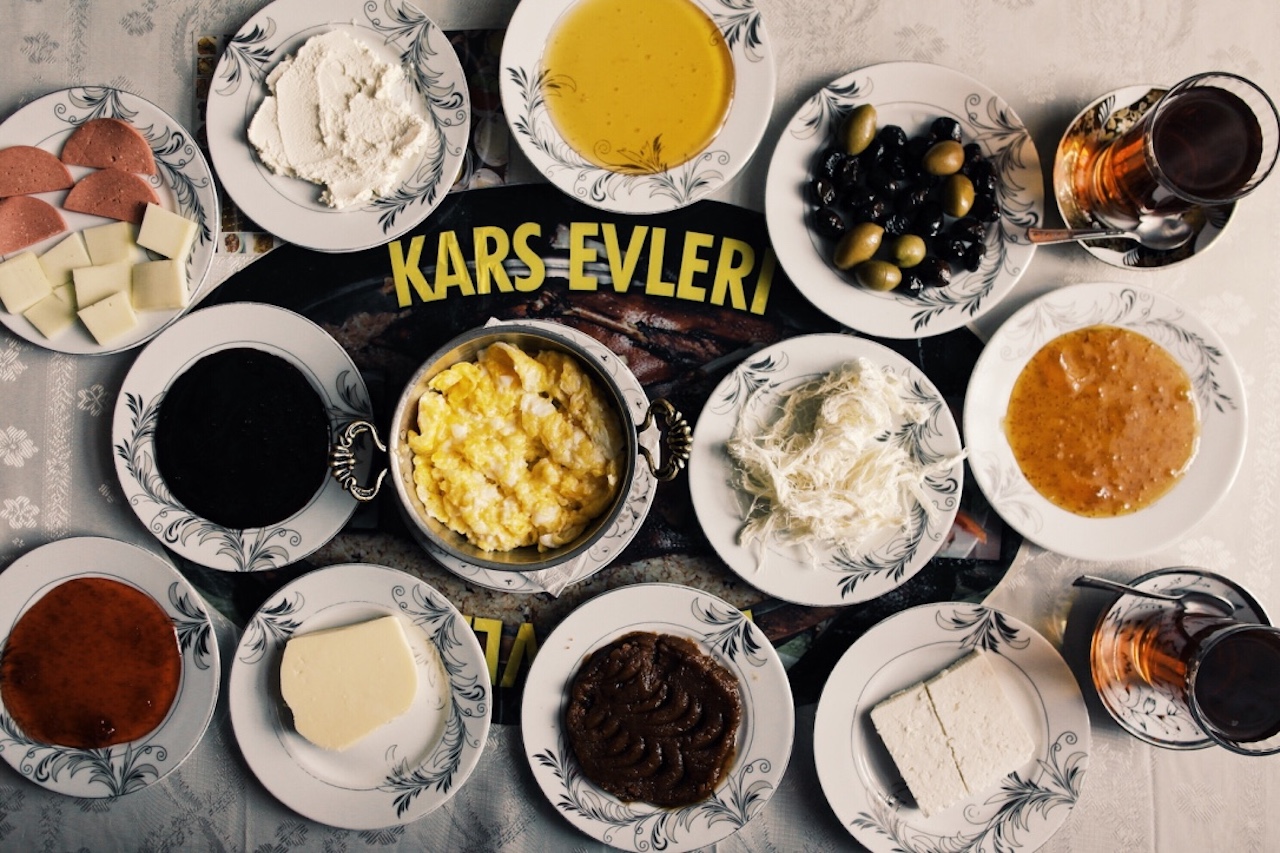Bu sabah kahvaltıyı öğretmenevinde yapmıyoruz. Yolun karşısındaki Kars Evleri’ni gözümüze kestirmiştik. Uzun ve dolu dolu bir kahvaltı yapıyoruz. Soğukta üşümemek için iyice doyurmak lazım karnı. Helvasıydı, balıydı, kaymağıydı ne bulursan kalori hesabı yapma götür. 🙂