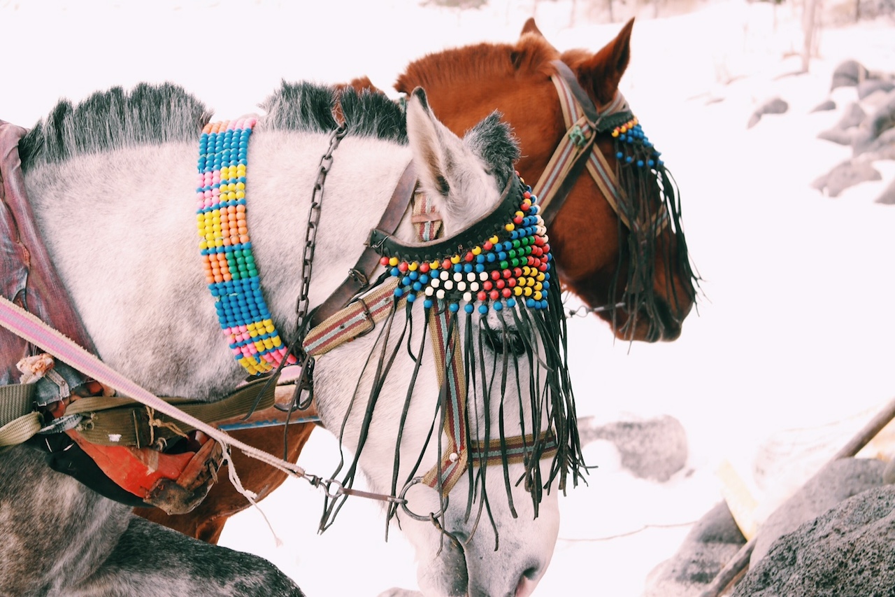 Karnımız doydu, çıtır çıtır yanan sobanın başında keyif de yaptık artık yeniden soğuğa çıkmaya hazırız. Gölün ve gökyüzünün beyazlığına inat, çaputlar bağlanmış rengarenk bir ağaç ve gelin gibi süslenmiş atlar çok masalsı geliyor.