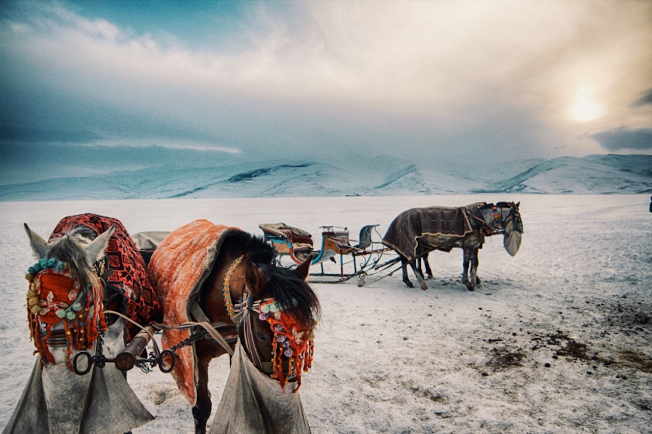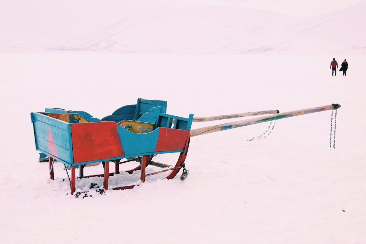 Dönmeden önce atlı kızaklarla kısa bir tur yapıyoruz. Rüzgar artıyor, soğuk iyice ısırmaya başlıyor. Karslılar “Göl bu sene çok donmadı” diyorlar. Buz kalınlığı yeterli olmadığı için bahsettiğim etkinlikler organize edilmemiş bu yıl. Biz de kıyıdan kıyıdan, 10 dakika kadar dolanıyoruz, yetiyor.