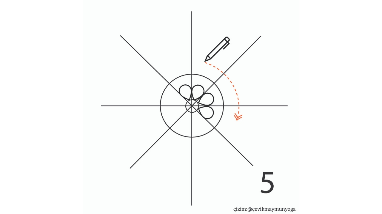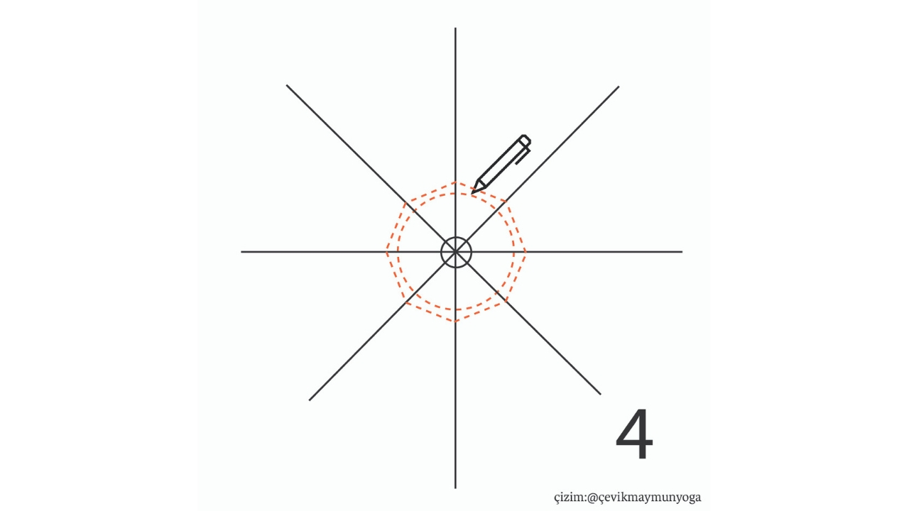 4- Merkezden başlayarak, yardımcı çizgilerinizi kesen bir daire ya da çokgen çizin ve iki merkez arasında kalan alanı, seçeceğiniz bir şekil ile merkezdeki daire etrafında simetrik olarak çizmeye başlayın. Bu şekil bir yuvarlak, bir su damlası, bir üçgen ya da dilediğiniz, içinizden geçen bir sembol olabilir.