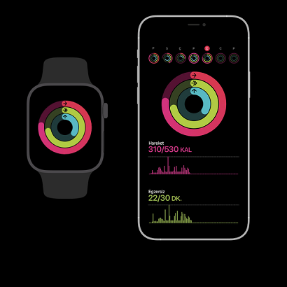 Apple Watch’taki Aktivite halkaları ne kadar hareket ettiğinizi, egzersiz yaptığınızı ve ayakta durduğunuzu takip ediyor. Hedefiniz, halkaları her gün tamamlamak. Ve halkaların dolduğunu görmek gerçekten iyi bir motivasyon kaynağı oluyor. iPhone ise Aktivite geçmişinizin ve trendlerinizin yanı sıra tüm antrenmanlarınızın ayrıntılı özetlerini göstererek motivasyonunuzu daha da yükseltiyor.