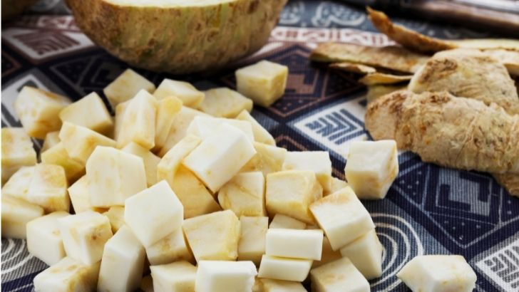 1.Soyduktan sonra kerevizi ve kırmızı soğanı eşit küpler halinde doğrayın.