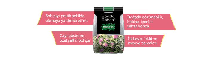 Büyülü Bohça serisi bohçayı pratik bir şekilde sıkmaya yardımcı etiketi ve çayı gösteren özel şeffaf bohçasının yanı sıra iri kesim bitki ve meyve parçalarıyla lezzet deneyimini de artırıyor. Doğada çözünebilir, bitkisel içerikli şeffaf bohçası ve dış jelatinsiz yeni ambalajı ile ise daha yeşil bir dünya için doğadan doğaya %100 dönüşüm sağlıyor.