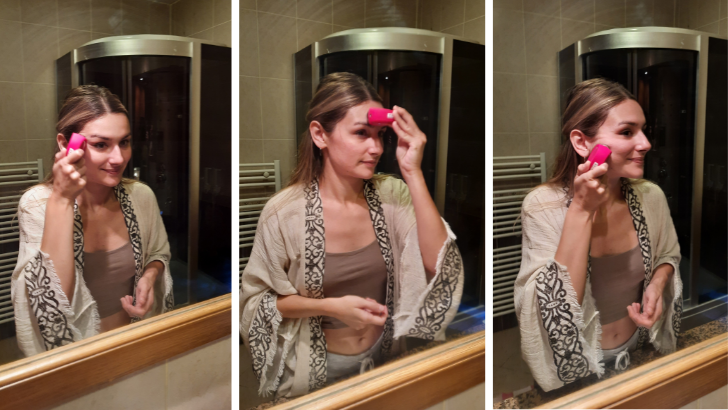 Uygulamadaki modelin yönlendirmeleri doğrultusunda, BEAR’ın metal kürelerini elmacık kemiklerimden şakaklarıma doğru, çene hattımda ve alın bölgemde yukarı-aşağı hareketlerle 3 dakika süresince hafifçe bastırarak gezdiriyorum. BEAR’ın gövdesi silikon malzemeden yapılmış olduğu için kavraması oldukça kolay ve uygulama sırasında asla elimden kaymıyor.