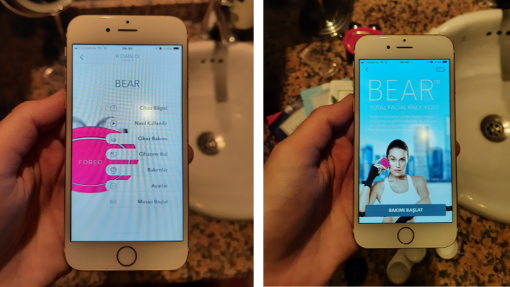 Serumumu cildimin tamamına eşit olarak dağıttıktan sonra telefonumdaki FOREO for You uygulamasını açıyorum ve BEAR cihazıma bağlanarak bakımımı seçiyorum. Mikro akım seviyesini belirledikten ve T-Sonic titreşimleri de ayarladıktan sonra bakım için hazırım!