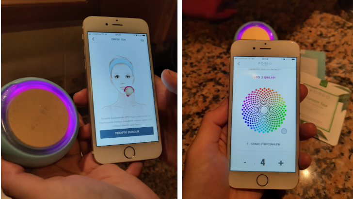 Cildim güzelce sıkılaştıktan ve rahatladıktan sonra, ihtiyaçlarına uygun içeriklerle derinlemesine bakım yapan FOREO UFO 2 ile yüz bakım terapime başlıyorum. UFO 2, beraberinde kullanılan FOREO UFO Power Maskelerdeki aktif bileşenlerin ciltteki etkisini artırmak için 45 santigrat dereceye kadar anında hızlı ısıtma, şişkinliği azaltmak ve gözenekleri küçültmek için 5 santigrat dereceye kadar anında hızlı soğutma, ciltte farklı faydaları ve etkileri bulunan tam spektrumlu 8 farklı led ışık ve nazikçe masaj yaparak ürünlerin ciltteki emilimini arttıran T- Sonic titreşimler ile her bir bakım için özelleştirilmiş yüz bakım terapileri sunuyor.