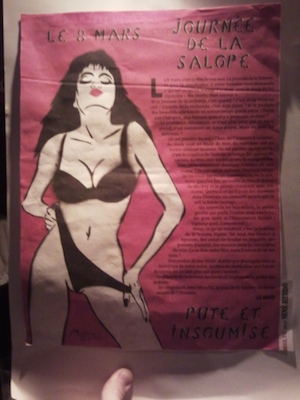 Araştırmalarım sonucunda bu posterin feminist bir sokak sanatçısı olan “Miss Tic” tarafından hazırlandığını öğrendim. Öncelikle kendisi oldukça meşhurmuş, eserlerini Paris’in her yerinde görebilmeniz mümkünmüş. Benim merak edip duvardan aldığım poster ise ilgi çekici başlığının yanında (‘8 Mart: O.. günü’ ) sonundaki ilginç başka bir söylemle dikkatimi çekti: ‘Fahişe ve asi’.