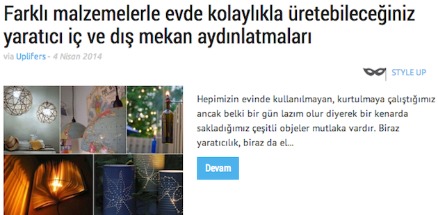 Masrafsız ve basit malzemelerle üretebileceğiniz  yaratıcı iç mekan aydınlatmasına ilişkin dekorasyon önerileri için Uplifers Style Up kategorisindeki dekorasyon önerilerine bakabilirsiniz. Tek başınıza, kısa sürede üretebileceğiniz birbirinden yaratıcı aydınlatma fikirleri ve diğer dekorasyon fikirleri için tıklayınız.