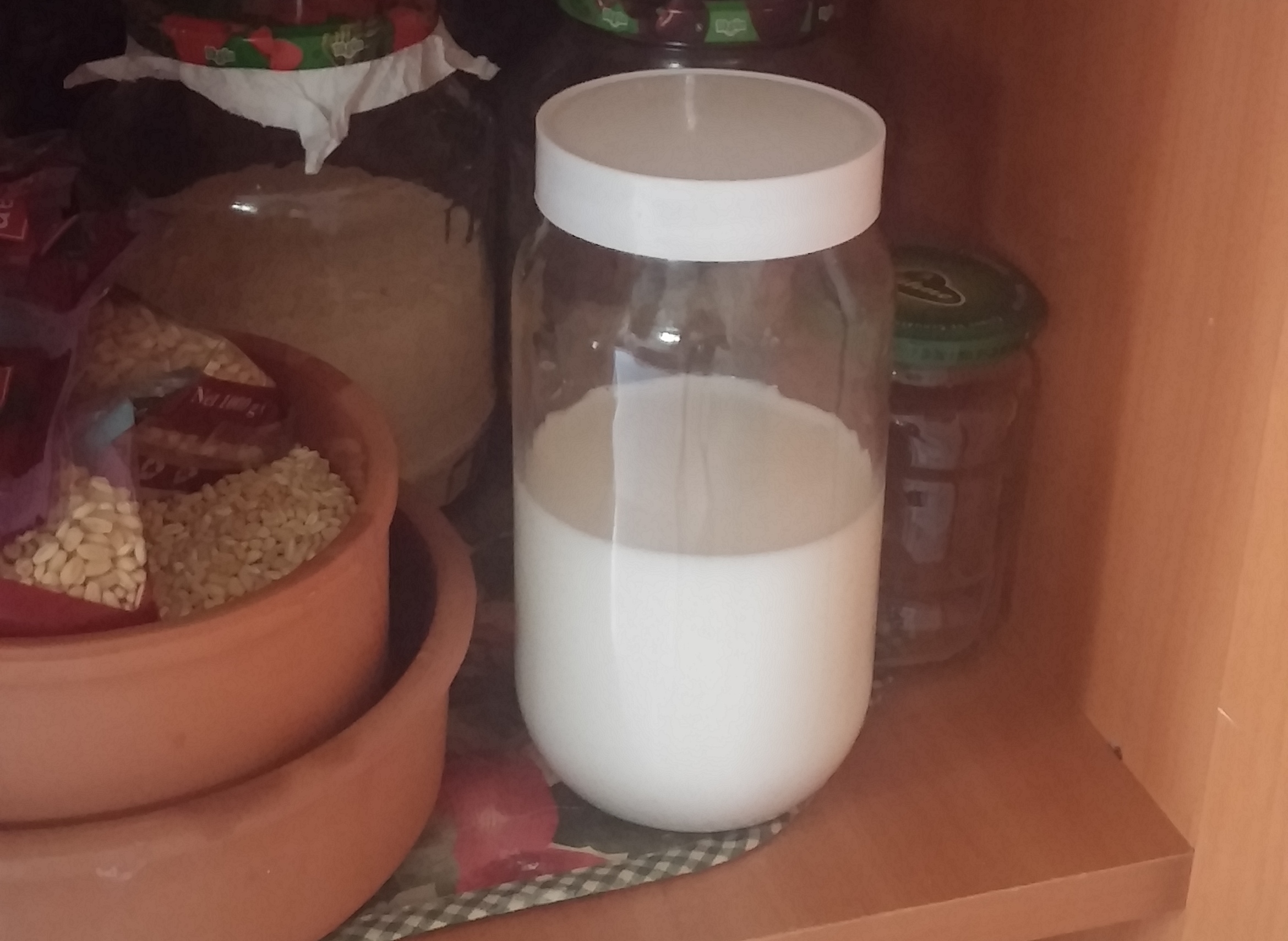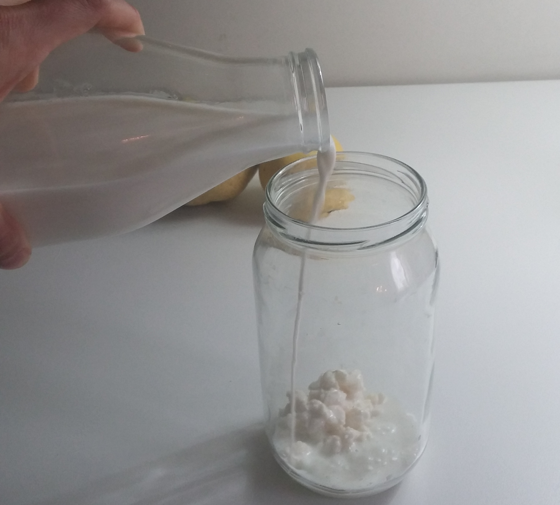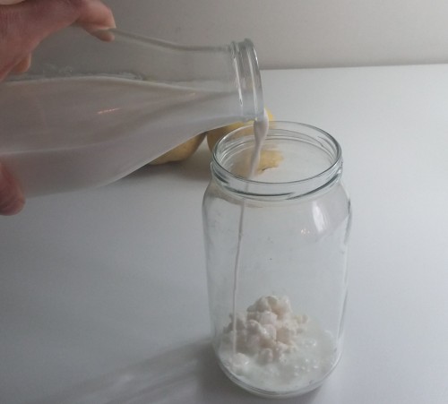 2) Kefir mayasını cam bir kavanoza koyun ve üstüne süt ekleyin. Kavanozu kapattın. Önemli olan kapağın cam veya plastik olması.