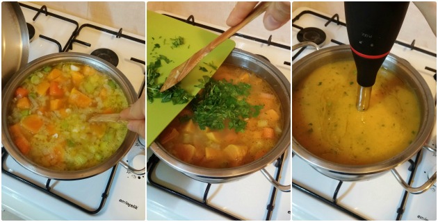 Ateşten aldıktan sonra, küçük küçük doğradığınız maydanozu çorbanın içine koyun. Blender ile çorbayı püre haline getirin. Biraz süt ekleyin. Afiyet olsun.