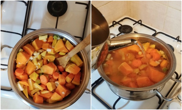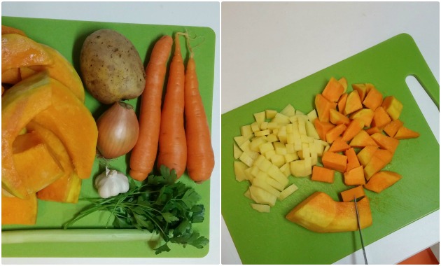 Önce bütün sebzeleri soyun. Patates ve balkabağını büyük küpler halinde, soğan, pırasa, havuç ve sarımsakları küçük küçük doğrayın.
