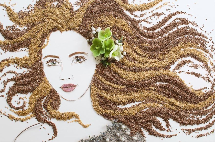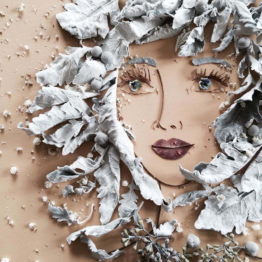Bazen yere rastgele düşmüş bir yaprak çantanın içine giriyor, oradan da resmin bir parçası olan bir kaşa veya bir köpeğin kulağına dönüşüveriyor. İnce dal parçaları ise elmacık kemiği veya çene çizgisine dönüşebiliyor. Parçaların şekillerine göre sonsuz sayıda olasılık olabiliyor. Stüdyoda ise küçük parçalar bir bütüne dönüşmeye başlıyorlar. Taze gül yaprakları bir yüz için mükemmel dudaklara dönüşebilirler. Cımbız ile dikkatlice yerleştirilen beyaz gül yaprakları ise göz akı ve makyaj için kullanılabiliyor. Önemli olan hassas çalışmak ve parçaların dağılmasını önlemek için hapşırmamaya dikkat etmek.