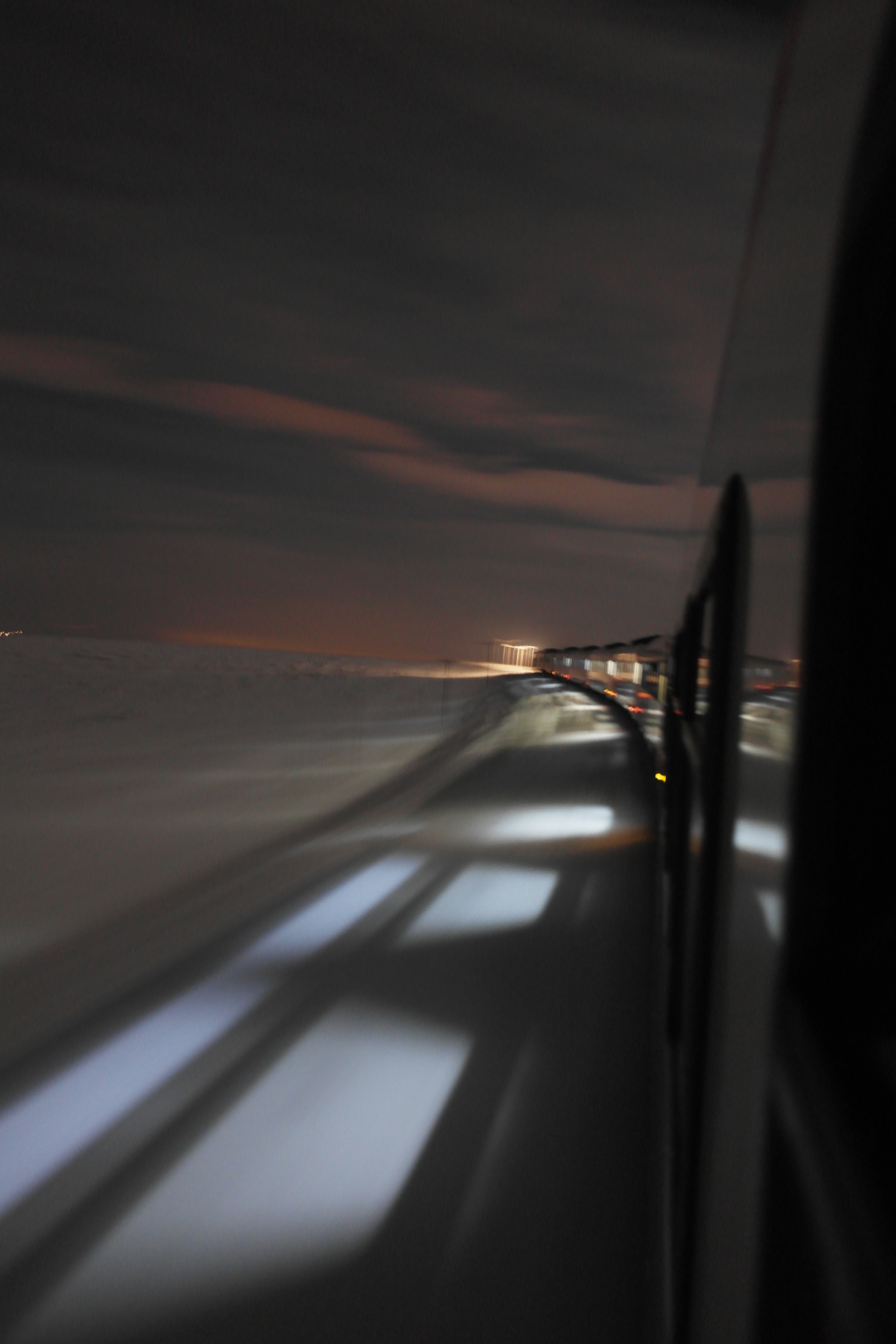 Trenin son vagonundan baş tarafa doğru yürüyoruz. Vagonları birbirine bağlayan kapılar tıslaya tıslaya açılıyor ama yemekli vagona bir türlü varamıyoruz. Ve “Girilmez” yazısı ile trenin lokomotif kısmına geldiğimizi anlıyoruz.