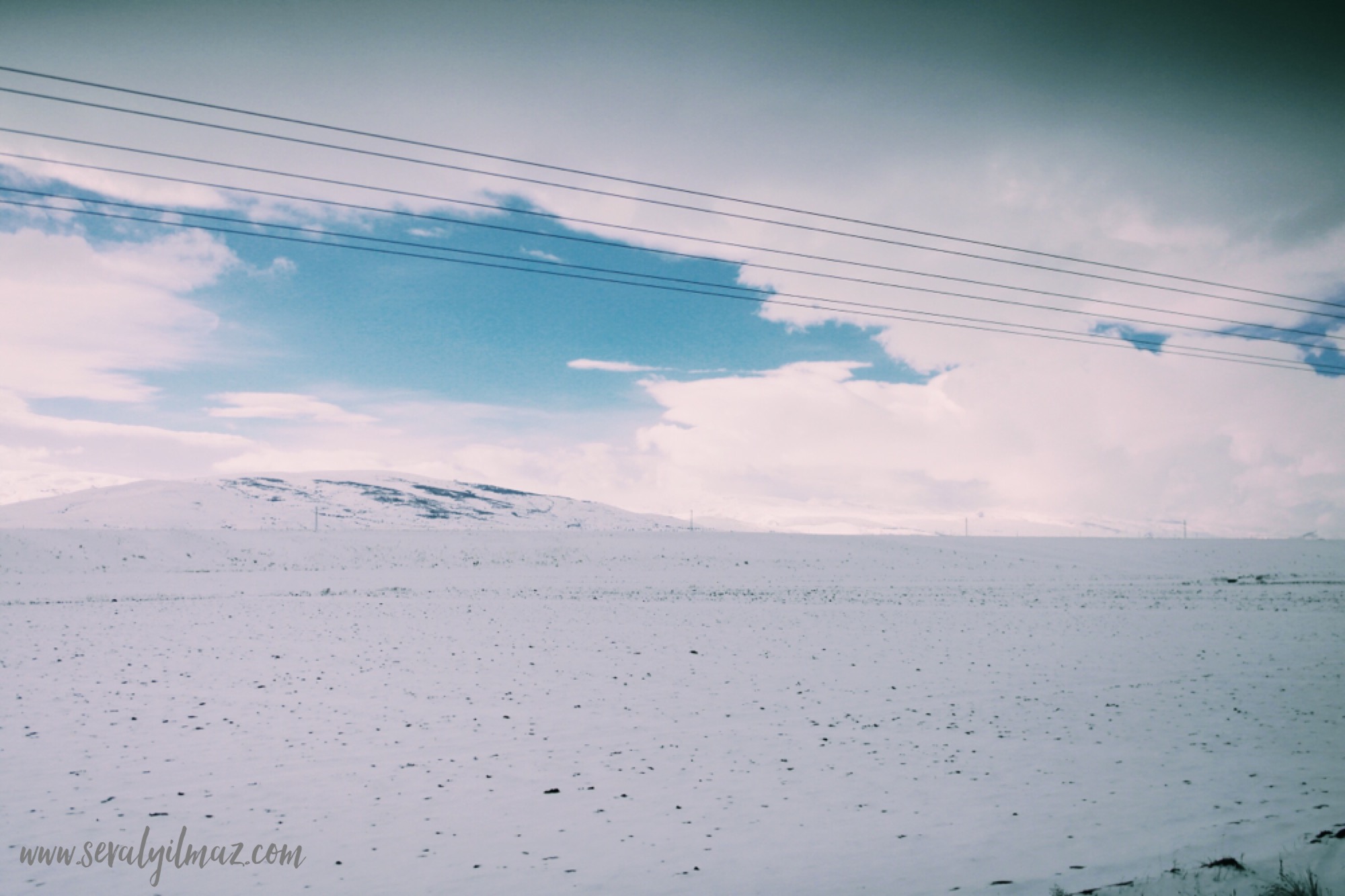 Yol boyunca dereler, tepeler, dağlar, göller geçiyoruz. Kars’a yaklaştıkça etraf daha da beyazlaşıyor. Bazen öyle anlar oluyor ki; bembeyaz, dümdüz bir ova uzanıyor önümüzde. Gökyüzünün beyazlığı ile buluşunca ufuk çizgisi eriyip gitmiş, sonsuz bir boşluk hissi kaplıyor içimizi.