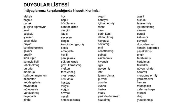 Okullarda da duygular konusu işlenirken genellikle dört temel duygudan ya da beş, altı duygudan bahsediliyor. Fakat aslında onlarca farklı duygu var ve her duygunun altında yatan çok farklı ihtiyaçlar olabiliyor. Bu yüzden önce duygularımızı, ihtiyaçlarımızın karşılanması veya karşılanmaması durumunda hissettiklerimiz olarak ayırarak listelenmiş olan bir kaynak (siddetsiziletisim.com), buna ek olarak da duygu ve olası ihtiyaçlarımızı gösteren “Başka bir okul mümkün”ün hazırlamış olduğu posteri paylaşacağım. Dilerim bu kaynaklar kendimizin, çocuklarımızın, öğrencilerimizin veya bireysel ilişkilerimizde temas ettiğimiz kişilerin duygularını anlayabilme yolculuğunda rehberlik edebilir.