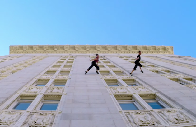 Amerika’nın Kaliforniya eyaletinde Oakland Belediye Binası’nın yan duvarından kendilerini iple sarkıtan çift, hiç zorlanmadan, yer çekimine karşı koyarak dans etti.