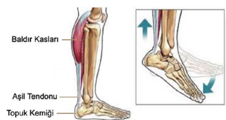 Bacağımız rahat durumdayken ayağımızın uzandığı yöne bakacak olursak, ayağın bacağa dik olmadığını ve yaklaşık 45 derecelik bir açıyla uzandığını görürüz. Yani ayağımız aslında hafif eğimli bir zeminde, normalde olması gerektiği şekilde durur. Aşil tendonu, ayağın bu konumda durmasını sağlar. Sürekli düz ayakkabı giyen kişilerde bileğin arkasındaki aşil tendonu gereğinden fazla esner ve bazen yırtılabilir.