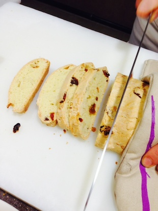 Ama bitmedi; ne demiştik 2 kere fırınlıyoruz! 25 dk sonra, yani hamurlarımız kızarınca fırından çıkardık ve sıcak sıcak dilimledik onları. İnce, uzun olması çok önemli. Tam bir İtalyan kesimi! Sonra kestiğimiz dilimleri yine tepsiye dizip tekrar fırına attık ve renkleri biraz daha kızarınca fırından çıkardık.