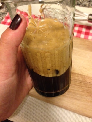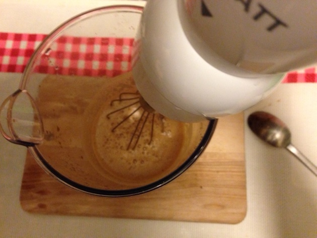 Bir kaba 2 tatlı kaşığı hazır kahve ve istediğiniz kadar şeker koyduktan sonra, 4-5 tatlı kaşığı su ekleyip 30 saniye kadar çalkalayın. Biz mikserle yaptık güzel köpürsün diye.