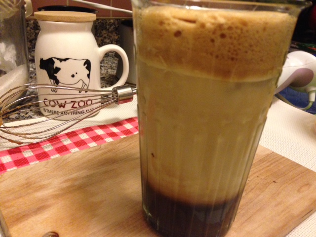 Bardağa bir kaç tane buz koyup, çalkaladığınız karışımı bunların üzerine yavaşça dökün. Çok yavaş dökün ki köpük sönmesin. Bardağa çok az soğuk süt ekleyip, kalan kısım için soğuk su ilave edin.