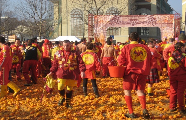 İtalya’nın en büyük yemek savaşı olan Portakal Festivali, katılımcıların organize gruplar halinde birbirlerine portakal fırlatmasıyla gerçekleşiyor.