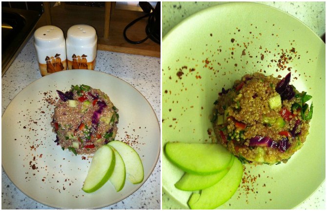 4) Kinoa soğuyunca, üzerine 1 kaşık zeytinyağını, lahanayı ve nar ekşisini ekliyoruz.